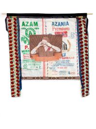 Digitaldruck auf Baumwolle, Perlen, Futtersäcke, Glitzer, Filz, afrikanische Wachsstoffe, Bänder, 119 × 125 cm