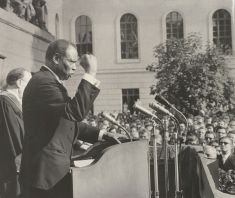 Paul Robeson bei einer Rede im Vorhof der Humboldt-Universität zu Berlin, nachdem ihm die Philosophische Fakultät die Ehrendoktorwürde verliehen hatte, 5. Oktober 1960